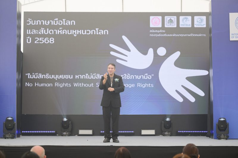 สมาคมคนหูหนวกแห่งประเทศไทย ร่วมกับกรมส่งเสริมและพัฒนาคุณภาพชีวิตคนพิการ และพันธมิตรจากภาครัฐและเอกชน จัดงาน “วันภาษามือโลกและสัปดาห์คนหูหนวกโลก ประจำปี 2568” ขึ้นต่อเนื่องเป็นครั้งที่ 9 ระหว่างวันที่ 27–28 กันยายน 2568 ณ บริเวณลานจอดรถ เดอะสตรีท รัชดา ภายใต้แนวคิด “No Human Rights Without Sign Language Rights” หรือ “ไม่มีสิทธิมนุษยชน หากไม่มีสิทธิในการใช้ภาษามือ” ตอกย้ำความสำคัญของสิทธิในการสื่อสารด้วยภาษามือ โดยได้รับเกียรติจากนางสาวสนธยา บุณยภูษิต หัวหน้าผู้ตรวจราชการกระทรวงการพัฒนาสังคมและความมั่นคงของมนุษย์ ในนามผู้แทนจากกระทรวงการพัฒนาสังคมและความมั่นคงของมนุษย์ เป็นประธานพิธีเปิดงาน