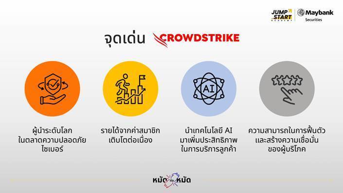 “นอกจากโอกาสของธุรกิจที่น่าจะเติบโตไปกับเทรนด์ดิจิทัลที่ความปลอดภัยบนโลกไซเบอร์เป็นสิ่งที่ขาดไม่ได้จากเหตุการณ์ระบบอัปเดตของ CrowdStrike ที่ส่งผลกระทบต่อระบบ Windows ทั่วโลกในปี 2024 ทำให้ราคาหุ้นปรับตัวลงแรงในระยะสั้น แต่หลังจากบริษัทเร่งปรับปรุงกระบวนการอัปเดต และเปิดทางให้ผู้ใช้งานสามารถเลือกเวลาในการอัปเดตได้ ราคาหุ้นของ CrowdStrike ก็ฟื้นตัวกลับขึ้นมาได้อย่างรวดเร็ว สะท้อนให้เห็นถึงความเชื่อมั่นของลูกค้าที่มีต่อบริษัทในระยะยาวอีกด้วย”