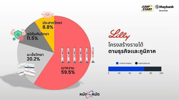 เริ่มจากฝั่งสหรัฐ แนะนำ Eli Lilly and Company บริษัทเวชภัณฑ์ชั้นนำจากสหรัฐอเมริกา ก่อตั้งขึ้นในปี 1876 เชี่ยวชาญในการค้นคว้า พัฒนา ผลิต และทำการตลาดผลิตภัณฑ์ด้านสุขภาพที่เป็นนวัตกรรมใหม่ มีสินค้าจำหน่ายในกว่า 125 ประเทศทั่วโลก จุดเด่นของ Eli Lilly คือ มีความเชี่ยวชาญด้านยาเฉพาะทาง เช่น เบาหวาน ภาวะอ้วน มะเร็ง และภูมิคุ้มกันบกพร่อง อีกทั้งยังมีการพัฒนายาเฉพาะทางและการรักษาแบบเฉพาะเจาะจง (Precision Medicine) รวมถึงมีการลงทุนอย่างต่อเนื่องในงานวิจัยและพัฒนา (R&D)