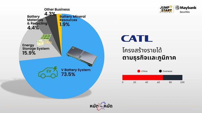 ขณะที่ฝั่งจีน แนะนำ Contemporary Amperex Technology Co. Limited (CATL) ผู้นำตลาดแบตเตอรี่ EV ทั่วโลก ครองอันดับ 1 ของโลกด้วย Market Share ประมาณ 37.9% ก่อตั้งในปี 2011 ดำเนินธุรกิจวิจัย พัฒนา ผลิต และจำหน่ายแบตเตอรี่ลิเทียมไอออนสำหรับรถยนต์ไฟฟ้า (EV) อีกทั้งยังเป็นผู้เชี่ยวชาญด้านการพัฒนาแบตเตอรี่สำหรับพาหนะไฟฟ้าหลากหลายประเภท ขยายธุรกิจสู่ตลาดใหม่ เช่น Energy Storage System (ESS) และ Battery-Swap ซึ่งเป็นหัวใจของห่วงโซ่อุตสาหกรรม EV ระดับโลก