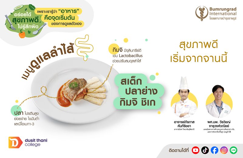 | อาหารเพื่อสุขภาพของระบบทางเดินอาหาร (ลำไส้) | สเต็กปลาย่างซอสกิมจิกระทะร้อน | · เนื้อปลา มีโปรตีนสูง ย่อยง่าย ไขมันต่ำ และมีโอเมก้า 3