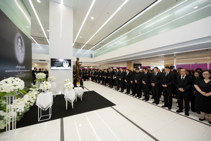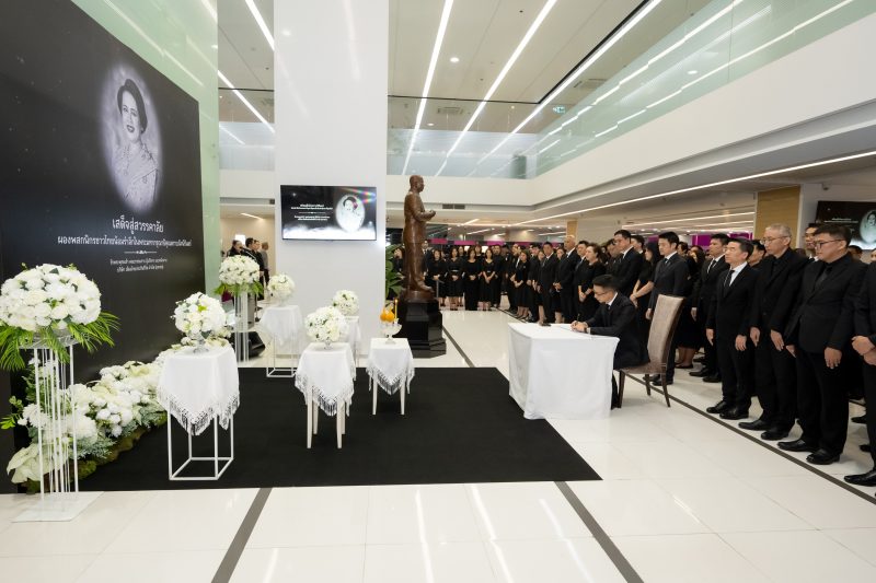 ในโอกาสนี้ นายสาระ ล่ำซำ ประธานเจ้าหน้าที่บริหาร ได้กล่าวถวายความอาลัย พร้อมกันนี้ คณะผู้บริหารและพนักงาน ได้พร้อมใจกันยืนสงบนิ่ง และลงนามในสมุดถวายความอาลัย เพื่อแสดงความจงรักภักดี และน้อมรำลึกถึงพระมหากรุณาธิคุณที่ทรงมีต่อพสกนิกรชาวไทย ตลอดระยะเวลาที่ทรงปฏิบัติพระราชกรณียกิจน้อยใหญ่นานัปการ ตามที่ทรงตั้งพระราชปณิธานอย่างแน่วแน่ ในการบำเพ็ญพระราชกรณียกิจมาตลอดพระชนม์ชีพ เพื่อบำบัดทุกข์บำรุงสุข แก่พสกนิกรชาวไทยในทุกหนแห่ง อีกทั้งยังทรงส่งเสริมงานด้านศิลปวัฒนธรรม หัตถศิลป์ไทย ตลอดจนการอนุรักษ์ธรรมชาติและสิ่งแวดล้อม รวมทั้งการพัฒนาคุณภาพชีวิตของประชาชนในถิ่นทุรกันดาร ซึ่งสะท้อนถึงพระเมตตาของสมเด็จพระนางเจ้าสิริกิติ์ พระบรมราชินีนาถ พระบรมราชชนนีพันปีหลวง สมดังพระราชสมัญญา “พระแม่ของแผ่นดิน”