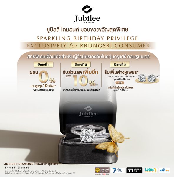 Jubilee Diamond ร่วมกับ Krungsri Consumer ร่วมเติมเต็มวันเกิดสุดพิเศษ รับต่างหูเพชรมูลค่ากว่า 32,000 บาท พร้อมส่วนลดเพิ่ม 10% ทุกชิ้น