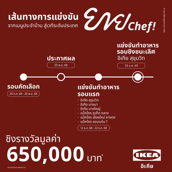 อิเกีย ประเทศไทย ร่วมกับ แม็คโคร เปิดเวทีการแข่งขันทำอาหาร “ยาย Chef – Granny Cooking Competition” เชิญชวนคนวัยเก๋าอายุ 60 ปีขึ้นไป ทุกเพศ ส่งเมนูเด็ดประจำบ้าน ถ่ายทอดรสมือแห่งความรักและความทรงจำ ผ่านจานอาหารที่อบอุ่นและเปี่ยมด้วยความหมาย การแข่งขันจัดขึ้นทั่วประเทศ ณ อิเกียและแม็คโครสาขาต่าง ๆ พร้อมชิงรางวัลรวมมูลค่ากว่า 657,000 บาท ทั้งชุดครัวในฝันจากอิเกียและบัตรกำนัลจากแม็คโคร เพื่อเฉลิมฉลองฝีมือและความคิดสร้างสรรค์ของเชฟรุ่นเก๋า
