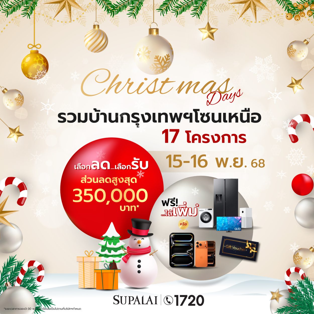 บริษัท ศุภาลัย จำกัด (มหาชน) ส่งท้ายปี 2568 ด้วยความพิเศษแบบจัดเต็ม กับงาน “Supalai Christmas Days” รวมโครงการคุณภาพทั้งบ้านเดี่ยว บ้านแฝด และทาวน์โฮม 17 โครงการยอดนิยมในโซนกรุงเทพฯ ตอนเหนือ ในราคาเริ่มต้น 1.79-30 ล้านบาท* พร้อมข้อเสนอสุดพิเศษให้ลูกค้าเลือกได้ตามใจ ทั้ง “เลือกลด” หรือ “เลือกรับ” ส่วนลดมูลค่าสูงสุดถึง 350,000 บาท* และได้เพิ่มของแถมมูลค่าสูงสุด 100,000 บาท* ระหว่างวันที่ 15–16 พฤศจิกายน 2568 นี้เท่านั้น!
