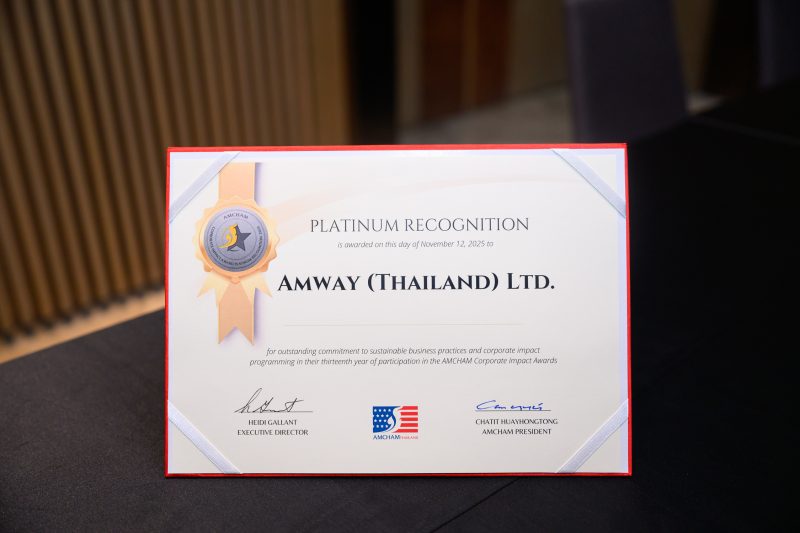 แอมเวย์ประเทศไทย นำโดยตัวแทนคณะกรรมการกิจกรรมเพื่อสังคม เข้ารับรางวัล “องค์กรที่สร้างความเปลี่ยนแปลงเชิงบวกให้กับสังคม” (AMCHAM Corporate Impact Awards) ระดับแพลตินัม จากหอการค้าอเมริกันในประเทศไทย (The American Chamber of Commerce in Thailand: AMCHAM) ต่อเนื่องเป็นปีที่ 13 ตอกย้ำความเป็นผู้นำด้านความรับผิดชอบต่อสังคมและสร้างความเปลี่ยนแปลงเชิงบวกให้กับผู้คนในสังคมไทย โดยมี คุณแคทเธอรีน สปิลแมน (ที่ 1 จากขวา) อัครราชทูตที่ปรึกษาฝ่ายพาณิชย์ ประจำสถานทูตสหรัฐอเมริกาประจำประเทศไทย มอบรางวัล พร้อมด้วย คุณไซมอน เดนย์ (ที่ 1 จากซ้าย) กรรมการบริหารหอการค้าอเมริกันในประเทศไทย ร่วมแสดงความยินดี ณ โรงแรม นิกโก้ กรุงเทพฯ เมื่อเร็ว ๆ นี้