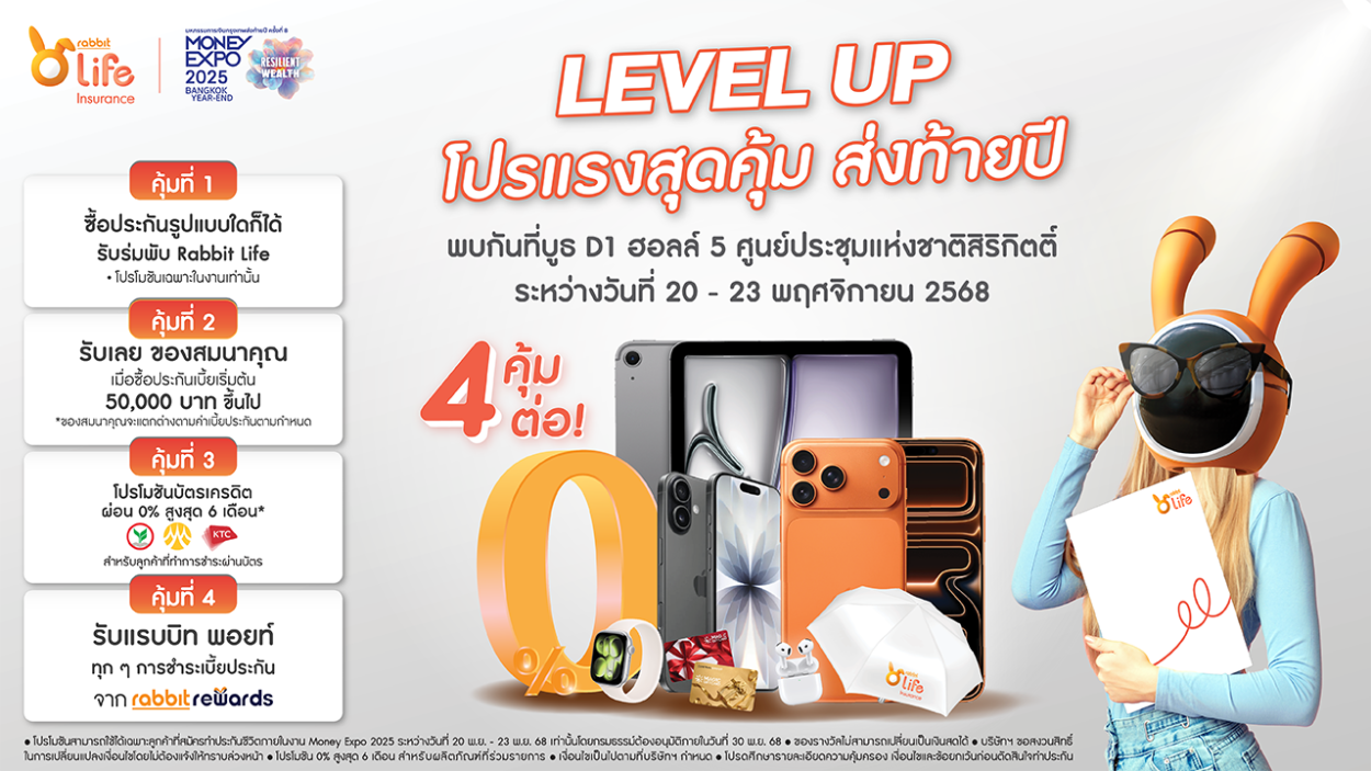 บริษัท แรบบิท ประกันชีวิต จำกัด (มหาชน) หรือ Rabbit Life บริษัทในเครือบริษัท บีทีเอส กรุ๊ป โฮลดิ้งส์ จำกัด (มหาชน) เตรียมยกทัพผลิตภัณฑ์ประกันลดหย่อนภาษีและโปรโมชันเด็ดส่งท้ายปี ร่วมงานมหกรรมการเงินกรุงเทพครั้งที่ 25 (MONEY EXPO BANGKOK YEAR- END 2025) จัดขึ้นภายใต้แนวคิด Resilient Wealth to Level Up Life หรือการสร้างความมั่งคั่งแบบยืดหยุ่น ทางด้านการเงิน สุขภาพ และการใช้ชีวิต พร้อมพลิกเกมความคุ้มแบบก้าวกระโดดถึง 4 คุ้ม ไม่ว่าจะเป็น คุ้มที่ 1: รับร่มพับสุดเก๋ เมื่อซื้อผลิตภัณฑ์ทุกรูปแบบ คุ้มที่ 2: รับเพิ่มของสมนาคุณ อาทิ Central Gift Voucher, AirPods 4, Apple Watch Series 11, iPad Air 128 GB, iPhone 17 Pro Max 256GB และอื่น ๆ อีกมากมาย เมื่อซื้อประกันเบี้ยเริ่มต้น 50,000 บาทขึ้นไป คุ้มที่ 3: โปรโมชันผ่อน 0% นานสูงสุด 6 เดือน สำหรับลูกค้าที่ชำระผ่านบัตรเครดิตที่ร่วมรายการ (KTC, Krungsri, และ KBANK) คุ้มที่ 4: รับแรบบิท พอยท์ ทุก ๆ การชำระเบี้ยประกัน จากแรบบิท รีวอร์ดส พบกันได้ที่บูธ D1 ศูนย์การประชุมแห่งชาติสิริกิตติ์ ระหว่างวันที่ 20 – 23 พฤศจิกายน 2568