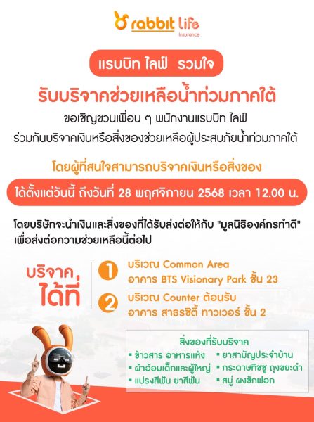 บริษัท แรบบิท ประกันชีวิต จำกัด (มหาชน) หรือ Rabbit Life บริษัทในเครือบริษัท บีทีเอส กรุ๊ป โฮลดิ้งส์ จำกัด (มหาชน) โดยนายกรณ์ ชินสวนานนท์ กรรมการผู้จัดการ บริษัท แรบบิท ประกันชีวิต จำกัด (มหาชน) พร้อมคณะผู้บริหาร มอบเงินบริจาคจำนวน 100,000 บาท แก่สภากาชาดไทย เพื่อสนับสนุนการช่วยเหลือผู้ประสบอุทกภัยในพื้นที่ภาคใต้พร้อมเชิญชวนลูกค้าสมาชิก Rabbit Life MYRewards เปลี่ยนพอยท์เป็นพลังบุญ ผ่านแอปพลิเคชัน Rabbit Rewards โดยทุก ๆ 140พอยท์ เท่ากับการบริจาค 20 บาท ผ่านมูลนิธิกระจกเงา และสภากาชาดไทย เพื่อส่งต่อความช่วยเหลือไปยังผู้ประสบภัยในพื้นที่อย่างเร่งด่วน