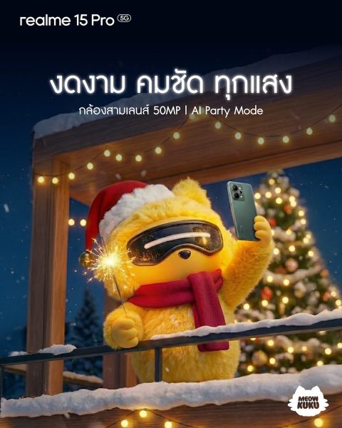 โดยเฉพาะ realme 15 Series 5G ที่ขึ้นแท่นเป็น AI Party Phone เก็บภาพสวยทั้งกลางวันและกลางคืนด้วย AI Party Mode พร้อมกล้องความละเอียด 50MP และถ่ายวิดีโอความละเอียด 4K ได้ทั้งกล้องหน้าและหลัง ช่วยให้ทุกโมเมนต์ของคุณพร้อมแชร์ในคุณภาพระดับโปร