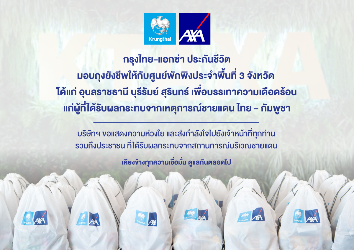 บมจ.กรุงไทย-แอกซ่า ประกันชีวิต ส่งมอบถุงยังชีพจำนวน 300 ชุด เพื่อช่วยเหลือประชาชนที่ได้รับผลกระทบจากสถานการณ์ชายแดนไทย-กัมพูชา โดยถุงยังชีพจะถูกส่งมอบให้ประชาชนผ่านศูนย์พักพิงประจำพื้นที่ 3 จังหวัด ได้แก่ จังหวัดอุบลราชธานีจังหวัดบุรีรัมย์และจังหวัดสุรินทร์ โดยทางบริษัทฯ ขอแสดงความห่วงใย และส่งกำลังใจไปยังเจ้าหน้าที่ทุกท่าน รวมถึงประชาชน ที่ได้รับผลกระทบจากสถานการณ์บริเวณชายแดน ทั้งนี้บริษัทฯ มุ่งมั่น เคียงข้างทุกความเชื่อมั่น ดูแลกันตลอดไป