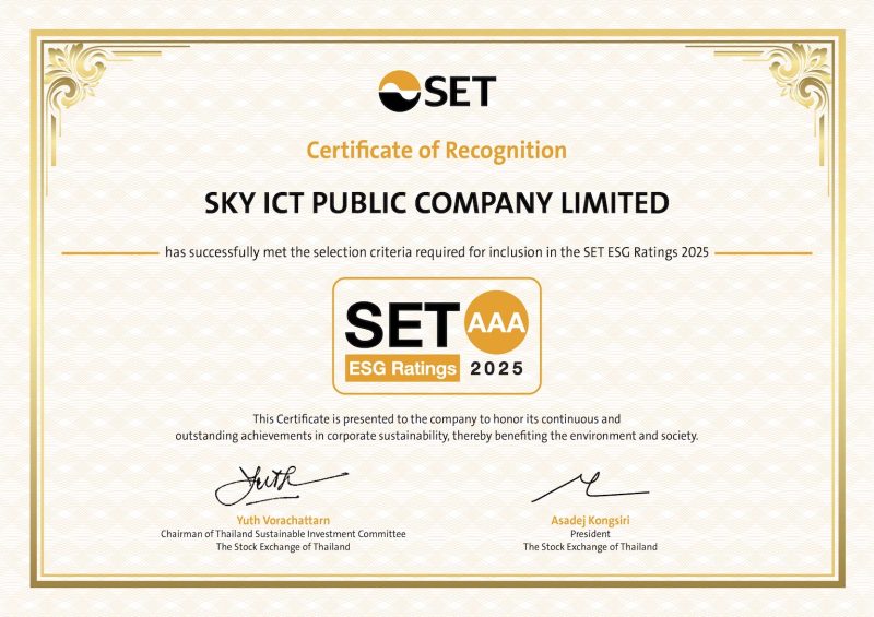 ทั้งนี้ SKY ICT ได้รับการจัดอันดับในระดับ “AAA” จาก SET ESG Ratings โดยคะแนน ESG ของ SKY ICT ทะยานระดับ Top-tier ตลาดทุนไทย สะท้อนความแข็งแกร่งเชิงโครงสร้าง ผลการประเมิน SET ESG Ratings 2025 แสดงให้เห็นอย่างชัดเจนว่า SKY ICT ไม่ได้เป็นเพียงบริษัทจดทะเบียนที่ “ผ่านเกณฑ์ ESG” แต่เป็นหนึ่งในองค์กรที่มี คุณภาพเชิงโครงสร้างเหนือกว่าค่าเฉลี่ยของตลาดอย่างมีนัยสำคัญ โดยบริษัททำ Total Score ได้สูงถึง 92 คะแนน สะท้อนให้เห็นว่า ผลลัพธ์ด้าน ESG ของบริษัทเกิดจากคุณภาพการบริหารจัดการและการวางกลยุทธ์ระยะยาว ที่ฝังอยู่ในโครงสร้างองค์กรสะท้อนความเป็นเลิศในการดำเนินธุรกิจภายใต้กรอบ Environmental, Social และ Governance (ESG) อย่างเป็นระบบ โปร่งใส และยั่งยืน ถือเป็นสัญญาณเชิงบวกต่อกลุ่มนักลงทุน สถาบัน และกองทุน ESG ทั้งในและต่างประเทศ ที่มองหาบริษัทจดทะเบียนซึ่งมีศักยภาพในการสร้างผลตอบแทนควบคู่ความยั่งยืนในระยะยาว โดยเฉพาะในช่วงที่กระแสการลงทุนอย่างรับผิดชอบ (Responsible Investment) กลายเป็นมาตรฐานใหม่ของตลาดทุนโลก โดยบริษัทที่สามารถรักษาเรทติ้ง ESG ในระดับสูงสุดได้อย่างต่อเนื่อง จะมีความได้เปรียบเชิงโครงสร้าง ทั้งในด้านต้นทุนเงินทุน ความเชื่อมั่นของผู้ถือหุ้น และโอกาสทางธุรกิจในอนาคต