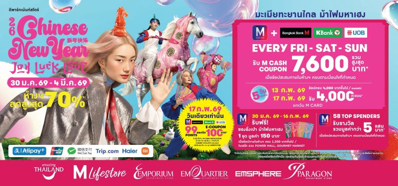 กลุ่มเดอะมอลล์ กรุ๊ป ชวนฉลองตรุษจีน 2569 แบบคุ้มครบทุกมิติ กับแคมเปญ “JOY LUCK LOVE CHINESE NEW YEAR 2026” รวมดีลช้อปแรง อั่งเปามหาเฮง และสิทธิพิเศษเฉพาะสมาชิก ครอบคลุมทุกวันสำคัญของเทศกาล ตั้งแต่วันจ่าย วันไหว้ ถึงวันเที่ยว ครบจบในที่เดียวตั้งแต่วันที่ 30 มกราคม – 4 มีนาคม 2569 ณ เดอะมอลล์ไลฟ์สโตร์ ทุกสาขา, เดอะมอลล์ โคราช, เอ็มโพเรียม, เอ็มควอเทียร์, เอ็มสเฟียร์ และพารากอน ดีพาร์ทเม้นท์สโตร์ ร่วมฉลองเทศกาลตรุษจีน มะเมียทะยานไกล ม้าไฟมหาเฮง กับบรรยากาศแห่งความเฮงทั่วทั้งศูนย์การค้า รับอั่งเปาและของมงคล รวมมูลค่ากว่า 8 ล้านบาท