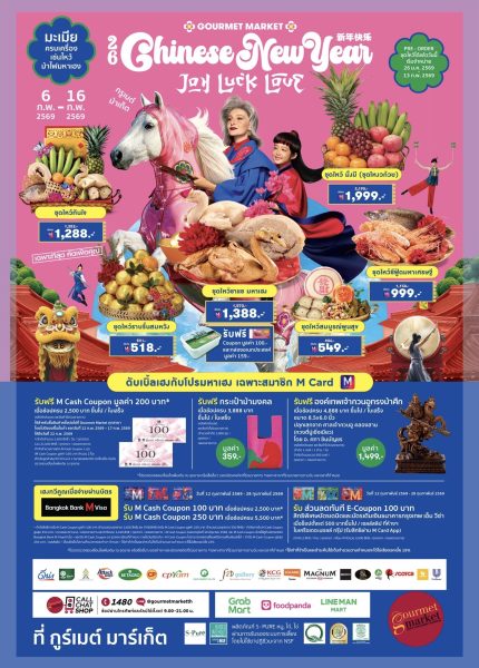 - ไหว้เสร็จ กินเสริมเฮงต่อได้ทันทีที่กูร์เมต์ อีทส์ กับเมนูมงคลกว่า 100 เมนู จากกว่า 50 ร้านดัง ที่ กูร์เมต์ อีทส์ ทุกสาขา ตั้งแต่วันที่ 4 – 17 ก.พ. 2569