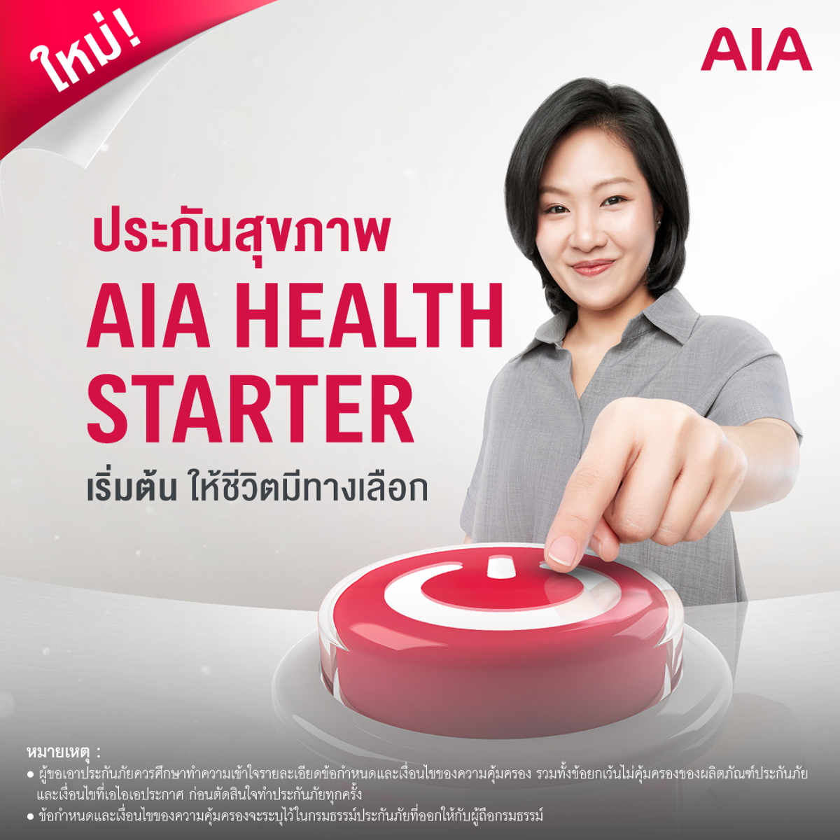 เอไอเอ ประเทศไทย ตอกย้ำผู้นำด้านประกันชีวิตและสุขภาพ เปิดตัวสัญญาเพิ่มเติมสุขภาพ “AIA Health Starter (เอไอเอ เฮลธ์ สตาร์ตเตอร์)” ให้คนไทยได้มีทางเลือกในการรับความคุ้มครองสุขภาพเพื่อความอุ่นใจในยามเกิดเหตุการณ์ไม่คาดคิด ด้วยเบี้ยประกันภัยที่เข้าถึงง่าย พร้อมรับความคุ้มครองค่ารักษาพยาบาลแบบ OPD (ผู้ป่วยนอก) และสนุกกับการดูแลสุขภาพพร้อมรับสิทธิประโยชน์แบบจุใจในโครงการ AIA Vitality ที่สำคัญให้คนไทยได้สบายใจยิ่งขึ้นเมื่อเข้ารับการรักษาที่โรงพยาบาลในโครงการ AIA Smart Network ด้วยค่ารักษาที่สมเหตุสมผล ลดค่าใช้จ่ายส่วนเกิน แถมยังลดปัญหาการเคลม อีกทั้งยังเป็นแบบประกันสุขภาพแรกที่มี Copayment (ค่าใช้จ่ายร่วม) ให้ลูกค้าได้มีทางเลือก เพื่อให้คนไทยได้เริ่มต้นมีสุขภาพและชีวิตที่ดีขึ้นอย่างยั่งยืนไปด้วยกัน ตามคำมั่นสัญญา Healthier, Longer, Better Lives