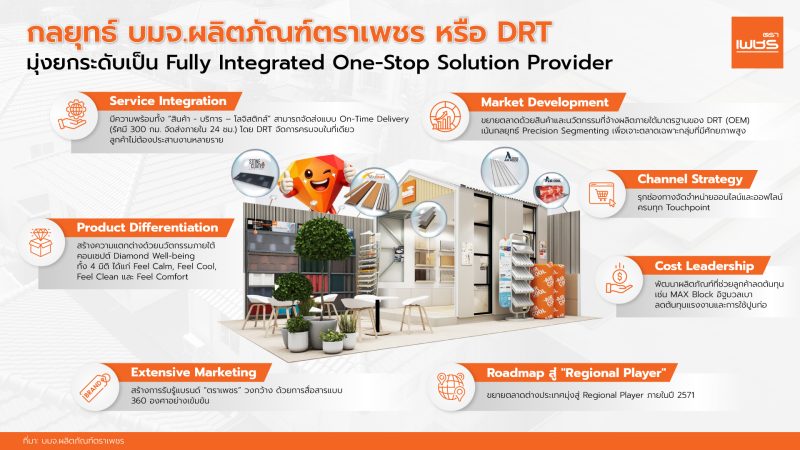 ดร.พิชญานันท์ ล้อวรลักษณ์ ผู้ช่วยประธานเจ้าหน้าที่บริหาร สายการขายและการตลาด บริษัท ผลิตภัณฑ์ตราเพชร จำกัด (มหาชน) หรือ DRT กล่าวว่า บริษัทฯ เพิ่มศักยภาพธุรกิจ โดยยกระดับจากผู้ผลิตวัสดุก่อสร้าง สู่การเป็น “Fully Integrated One-Stop Solution Provider” ที่ครอบคลุมทั้งสินค้า การจัดส่ง ติดตั้งและบริการหลังการขาย เพื่อตอบสนองความต้องการของลูกค้า โดยวางเป้าหมายปี 2569 – 2571 มีรายได้เติบโตเฉลี่ยปีละ (CAGR) 2-5% ผ่านการวางกลยุทธ์หลากหลาย เพื่อคว้าทุกโอกาสและเติบโตอย่างมั่นคง ได้แก่ 1) Service Integration โดยมีครบทั้ง “สินค้า- บริการ – การจัดส่ง” อาทิ กระเบื้องหลังคาไฟเบอร์ซีเมนต์, กระเบื้องหลังคาคอนกรีต, ไม้สังเคราะห์, อิฐมวลเบา, โครงหลังคาสำเร็จรูป, พื้น SPC, บริการติดตั้งหลังคา, พื้น SPC, เปลี่ยนและทาสีหลังคา ตลอดจนการจัดส่งสินค้าแบบ On-Time Delivery (รัศมี 300 กม. ส่งถึงภายใน 24 ชม.) โดยลูกค้าไม่ต้องประสานงานกับซัพพลายเออร์หลายราย 2) Market Development การขยายตลาดด้วยการจ้างผลิตสินค้า (OEM) ภายใต้มาตรฐานของ DRT และมุ่งเจาะตลาดเฉพาะกลุ่มผ่านกลยุทธ์ Precision Segmenting เช่น หลังคายูพีวีซี สำหรับฟาร์มและงานต่อเติม, ไม้สังเคราะห์ WPC เอ็กซ์ทรูชิลด์ และหลังคาเหล็กเคลือบผิวด้วยหินธรรมชาติ สำหรับโรงแรมและรีสอร์ท 3) Product Differentiation สร้างความแตกต่างด้วยสินค้านวัตกรรม “Diamond Well-being” ภายใต้แนวคิด “บ้านที่ดีไม่ใช่แค่แข็งแรงและสวยงาม แต่ต้องดูแลสุขภาพของคนในบ้าน” ที่ตอบโจทย์ 4 มิติ ได้แก่ Feel Calm ลดเสียงรบกวน, Feel Cool ลดความร้อนสะสม, Feel Clean ป้องกันความชื้น และ Feel Comfort ทนทาน ลดค่าบำรุงรักษา 4) Channel Strategy มีช่องทางเข้าถึงลูกค้าทั้ง Online และ Offline ครบทุก Touchpoint ได้แก่ Shopee เพื่อเป็น Digital Showroom และช่องทางขายสินค้าชิ้นเล็ก, ช่องทางห้างค้าปลีกสมัยใหม่, ร้านค้าผู้แทนจำหน่าย และโครงการอสังหาฯ เป็นสัดส่วนรายได้หลัก และกำลังขยายฐานลูกค้าภาครัฐและเอกชน 5) Extensive Marketing สร้างการรับรู้แบรนด์ “ตราเพชร” ในวงกว้างและกลุ่มคนรุ่นใหม่ที่จะสร้างบ้านผ่านการใช้ Media & Influencer 6) Cost Leadership ช่วยลูกค้าลดต้นทุนและสร้าง Loyalty โดยนำเสนออิฐมวลเบา Max Block ช่วยลดต้นทุนแรงงานและวัสดุ ก่อสร้างรวดเร็ว และ 7) Roadmap สู่ “Regional Player” เพื่อเติบโตอย่างยั่งยืน โดยวางแผนเพิ่มยอดขายในภูมิภาคอาเซียนและจะเร่งเดินเครื่องจักรโรงงานอิฐมวลเบา AAC 2 ให้เต็มประสิทธิภาพ