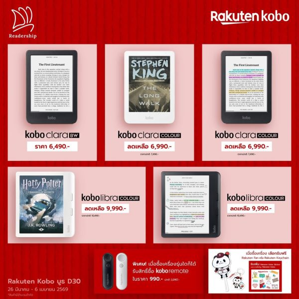 สำหรับการร่วมเป็นพันธมิตรอย่างเป็นทางการกับ ราคุเทน โคโบ นับว่าเป็นก้าวสำคัญ ที่ช่วยขยายฐานผลิตภัณฑ์ พร้อมทั้งยังช่วยสนับสนุนการไปสู่เป้าหมายด้านการเติบโตอย่างยั่งยืนในการส่งเสริมการใช้เครื่องอ่านอีบุ๊กเพื่อช่วยลดการใช้กระดาษ และตอบโจทย์ ESG ที่ผู้บริโภคให้ความสำคัญมากขึ้น ยิ่งไปกว่านั้นยังทำให้นักอ่านไทยได้สัมผัสกับผลิตภัณฑ์คุณภาพแบรนด์ระดับโลก ที่เป็นของแท้ทั้งเครื่องและอุปกรณ์ มีการรับประกันสินค้าและบริการหลังการขายจากผู้จัดจำหน่ายที่น่าเชื่อถือ ส่วนในการจัดจำหน่ายนั้น สามารถสั่งซื้อได้ผ่านทาง Readership.me , ร้าน B2S และ Marketplace ชั้นนำในเร็วๆ นี้ ส่วนโปรโมชั่นพิเศษเนื่องในโอกาสการเปิดตัวครั้งแรกจะจัดขึ้นที่งานสัปดาห์หนังสือแห่งชาติ ครั้งที่ 54 บู๊ธเลขที่ D30 ตั้งแต่วันนี้ – 6 เมษายน 2569 ณ ศูนย์การประชุมแห่งชาติสิริกิติ์ โดย Kobo Libra Colour จากปกติ 10,490 บาท ราคาพิเศษในงาน 9,990 บาท พร้อมรับอุปกรณ์เสริม Case,Stylus หรือ Remote ส่วน Kobo Clara Colour จากปกติ 7,490 บาท ราคาพิเศษในงาน 6,990 บาท และ Kobo Clara BW หน้าจอขาวดำ ในราคา 6,490 บาท พร้อมเคสหลายสีให้เลือกตามสไตล์