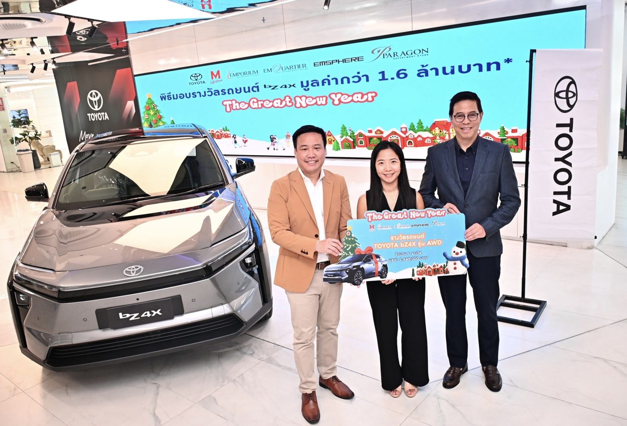 นที ศรีรัศมี ผู้อำนวยการใหญ่อาวุโส บริษัท เดอะมอลล์ กรุ๊ป จำกัด และ ณัทธร ศรีนิเวศน์ ผู้ช่วยกรรมการผู้จัดการใหญ่ สายงานการตลาด บริษัท โตโยต้า มอเตอร์ ประเทศไทย จำกัด มอบรางวัลใหญ่ รถยนต์ TOYOTA bZ4X รุ่น AWD มูลค่า 1,649,000 บาท ให้แก่ ณปภัช ศรีศึกษา ผู้โชคดีที่ร่วมช้อป จากแคมเปญ THE GREAT NEW YEAR ซึ่งจัดขึ้นเมื่อวันที่ 27 พฤศจิกายน 2568 – 11 มกราคม 2569 ที่ผ่านมา โดยพิธีมอบรางวัลจัดขึ้น ณ TOYOTA LIVE ALIVE บางนา เมื่อวันที่ 27 มีนาคม 2569 ที่ผ่านมา