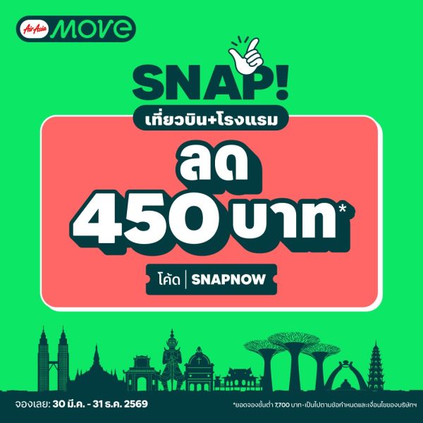 AirAsia MOVE จัดเต็มดีลสุดคุ้มต้อนรับฤดูกาลท่องเที่ยว (High Season) ให้คุณออกไปสำรวจโลกได้ในราคาประหยัดกว่าเดิม ด้วยส่วนลดพิเศษสำหรับจองโรงแรมทั่วโลก ลดเพิ่มทันที 400 บาท เพียงใส่โค้ด MOVEHOTELS50 (เมื่อมียอดจองขั้นต่ำ 3,000 บาท) และสำหรับสายเที่ยวแบบแพ็กเกจสุดคุ้มกับ SNAP! (เที่ยวบิน+โรงแรม) ทุกจุดหมายปลายทาง รับส่วนลดเพิ่ม 450 บาท เมื่อใส่โค้ด SNAPNOW (เมื่อมียอดจองขั้นต่ำ 7,700 บาท) จองเลยวันนี้ที่แอป AirAsia MOVE เพื่อสัมผัสประสบการณ์ “บิน พัก เที่ยว แอปเดียวครบ” ในราคาสบายกระเป๋า