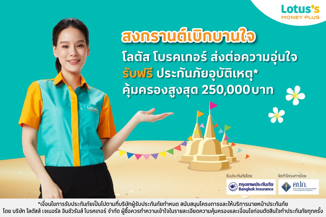 โลตัส โบรคเกอร์ สานพันธกิจ “พลัสความสุข ทุกความคุ้มค่า” ส่งต่อความอุ่นใจช่วงสงกรานต์ มอบกรมธรรม์ประกันอุบัติเหตุฟรี จำนวน 10,000 กรมธรรม์ให้กับประชาชนทั่วไป ตั้งแต่ 1 เมษายน 2569 – 31 พฤษภาคม 2569 (หรือจนกว่าสิทธิ์จะเต็ม) ด้วยความคุ้มครองอุบัติเหตุสูงสุด 250,000 บาท พร้อมค่ารักษาพยาบาลสูงสุด 5,000 บาท นาน 30 วัน โดยลงทะเบียนรับสิทธิ์ได้ที่เคาน์เตอร์โลตัส มันนี่ พลัสกว่า 200 สาขาทั่วประเทศ เพื่อส่งเสริมให้ประชาชนมีหลักประกันความคุ้มครองอุบัติเหตุและการเข้าถึงประกันภัย รวมถึงสนับสนุนนโยบายการสร้างการรับรู้ด้านประกันภัยของสำนักงานคณะกรรมการกำกับและส่งเสริมการประกอบธุรกิจประกันภัย (คปภ.) กรมธรรม์ดังกล่าวให้บริการนายหน้าประกันภัยโดย บริษัท โลตัสส์ เจเนอรัล อินชัวรันส์ โบรคเกอร์ จำกัด และรับประกันภัยโดย บริษัท กรุงเทพประกันภัย จำกัด (มหาชน) ทั้งนี้ รายละเอียดความคุ้มครองและเงื่อนไขเป็นไปตามที่ระบุไว้ในกรมธรรม์ ข้อมูลเพิ่มเติม https://lmp-mkt.link/13e484
